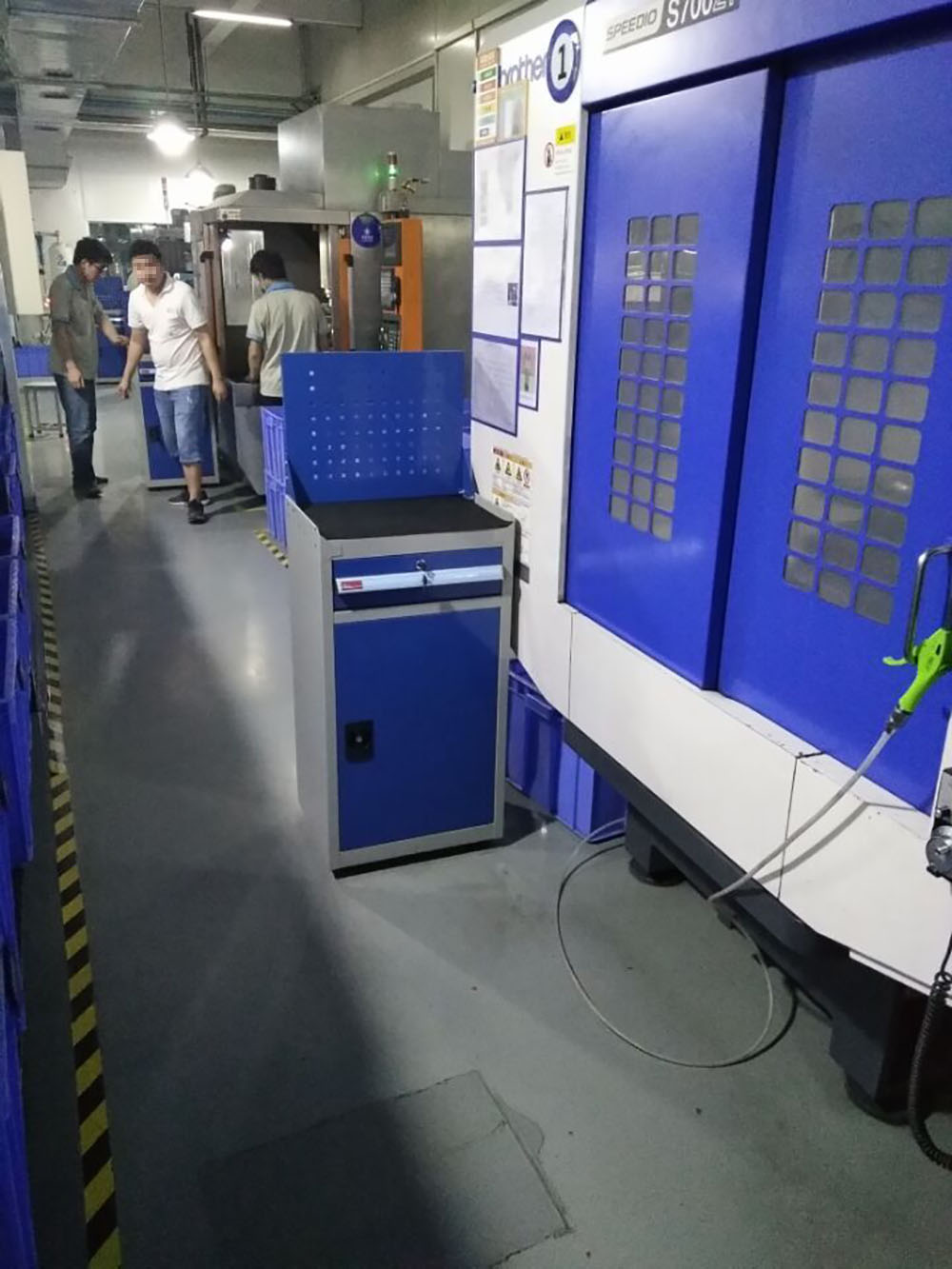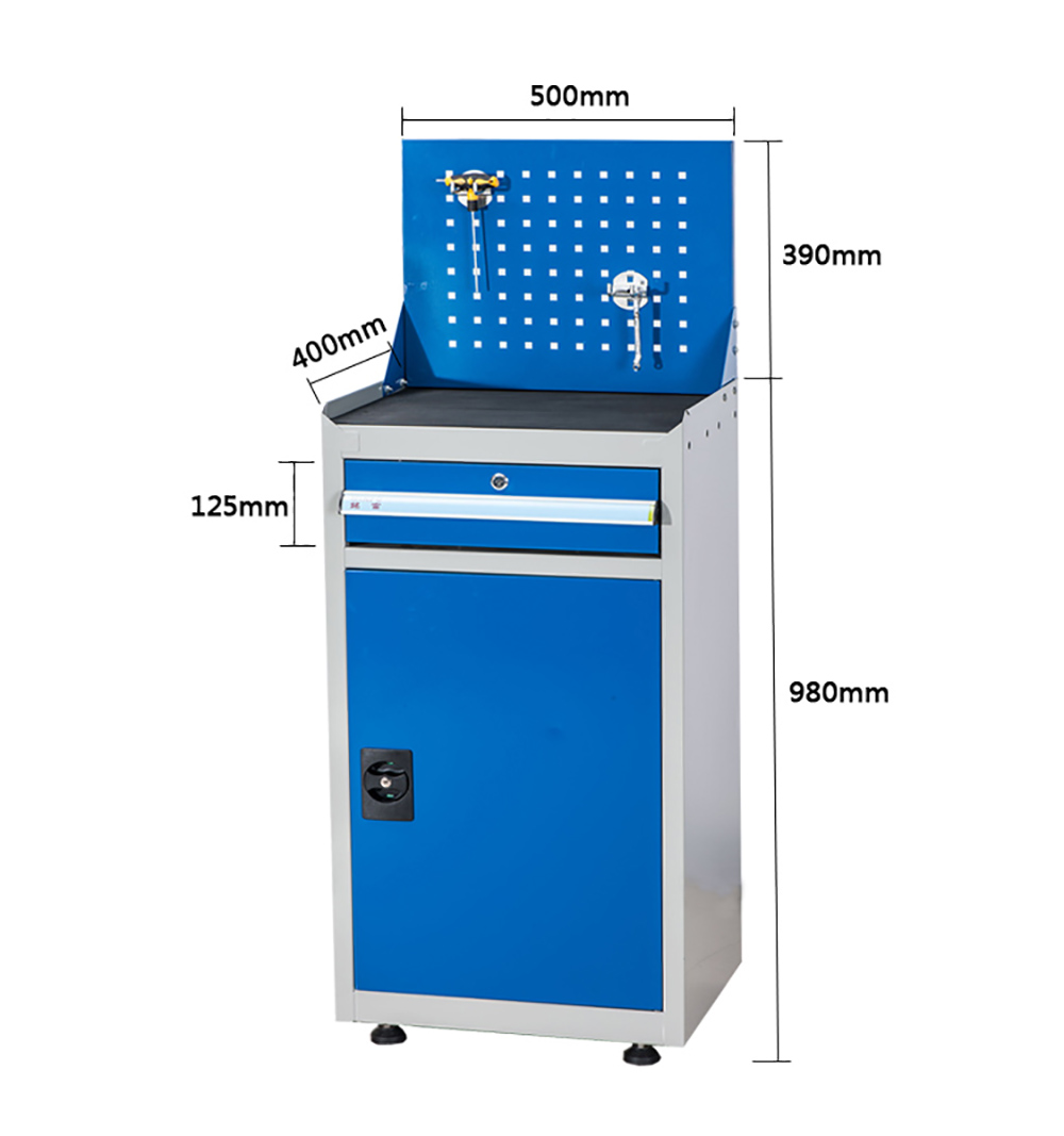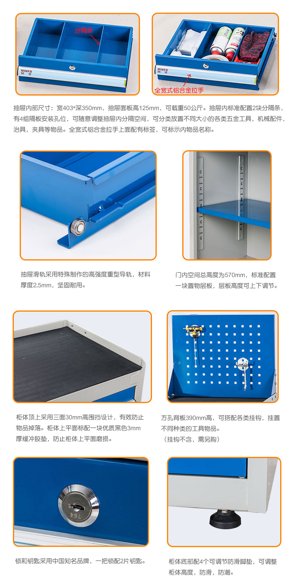 3. 柜體下方標準配置可調(diào)防滑減震墊腳。如需經(jīng)常移動,可改為下面裝腳輪,柜體側(cè)方加裝拉手方便推動工具柜。