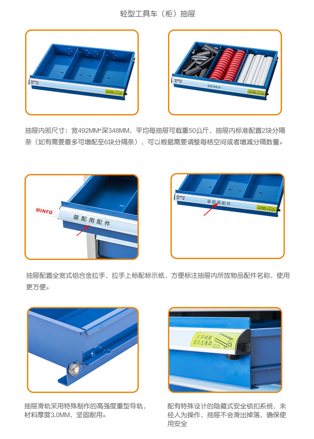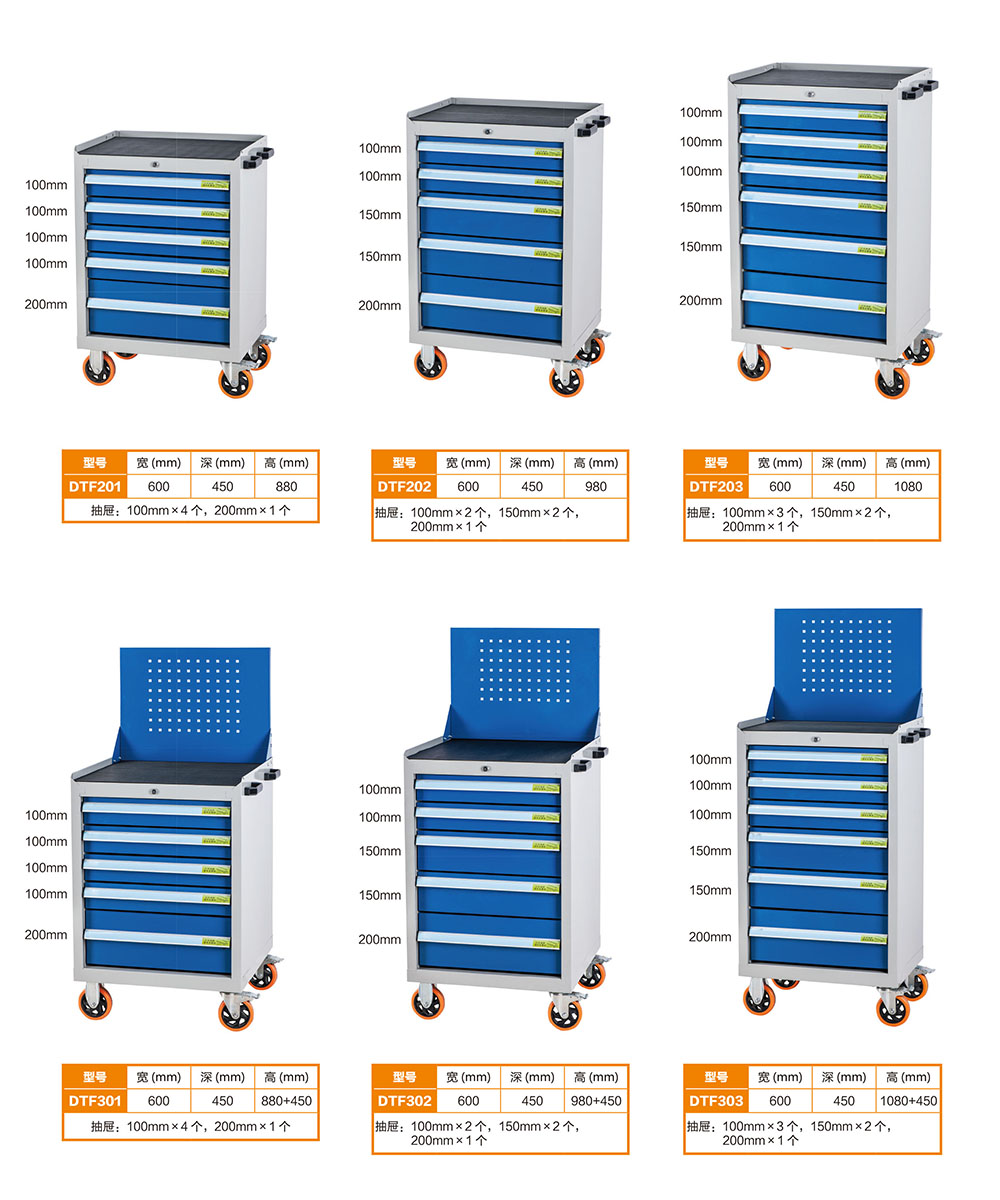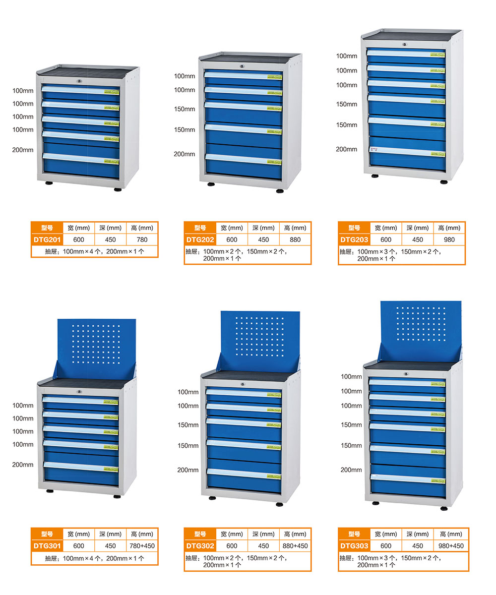 選型說明:1.輕型工具車柜體寬度都是600MM,深度都是450MM,不同的型號高度有區別。2.不同型號抽屜個數和抽屜面板高度有區別。3.柜體下面有配腳輪或者墊腳,根據需要選擇型號。4.柜體上方有帶背板款式和不帶背板款式。帶背板款式可配合其他掛件掛各種工具或圖紙。